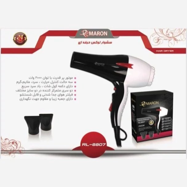 ازجمله عواملی است که بر زیبایی چهره تأثیر مستقیم میگذارد موهای خوشفرم و خوشحالت است که سشوار یکی از پرکاربردیترین وسیله برای داشتن موهای زیبا است؛ بنابراین پیشنهاد ما سشوار لوکس و حرفهای RL-8807 از برند پرومارون است که تمامی محصولات آن مورد تأیید استاندارد اروپا CE قرارگرفته است؛ و این سشوار هم از کیفیت بسیار بالای برخوردار است و دارای موتور پرقدرت AC با توان 2000 وات است که همین ویژگی منجر به عمر طولانی و قدرت بالای پرتاب باد دستگاه میشود و میتواند بهصورت مکرر و ممتد روشن بماند؛ که نهتنها برای مصرف خانگی بلکه برای مصارف حرفهای همچون آرایشگاهها بهترین انتخاب است. همچنین دارای کلید انتخاب حرارت با سه حالت کنترل سرد، ملایم و گرم هست که بسته به نیازتان یکی را انتخاب میکنید. از مشخصه سشوارهای باکیفیت تولید باد سرد است که این سشوار مجهز به دکمه کول شات (باد سرد سریع) هست و باعث میشود نهتنها موها سریعتر حالت بگیرند بلکه حالت موها را تثبیت کند. همچنین این سشوار دارای دو سری متمرکز کننده هوا در دو اندازه مختلف برای جهت دادن و متمرکز کردن هوای خروجی است. از طرفی فیلتر این سشوار قابلیت جدا شدن و شستوشو را دارد پس اگر پرز و گردوغبار گرفت میتوان فیلتر آن را جدا و تمیز کرد که به حفظ قدرت باد و افزایش طول عمر موتور کمک میکند. همچنین این سشوار به دلیل بدنه انعطافپذیر و مقاومی که دارد خاصیت نشکن بودن را پیداکرده است از انجایکه این سشوار هم دارای حلقه آویز و هم جعبه زیبا و مقاومی است بنابراین بعد استفاده یا میتوان آن را درجایی مخصوص آویز یا در جعبه مخصوص به خود نگهداری کرد. . به دلیل عملکرد دستگاه در محدوده ولتاژ جهانی 120-240 ولت میتوان آن را در هر جای دنیا همراه با خود داشته و استفاده نمایید