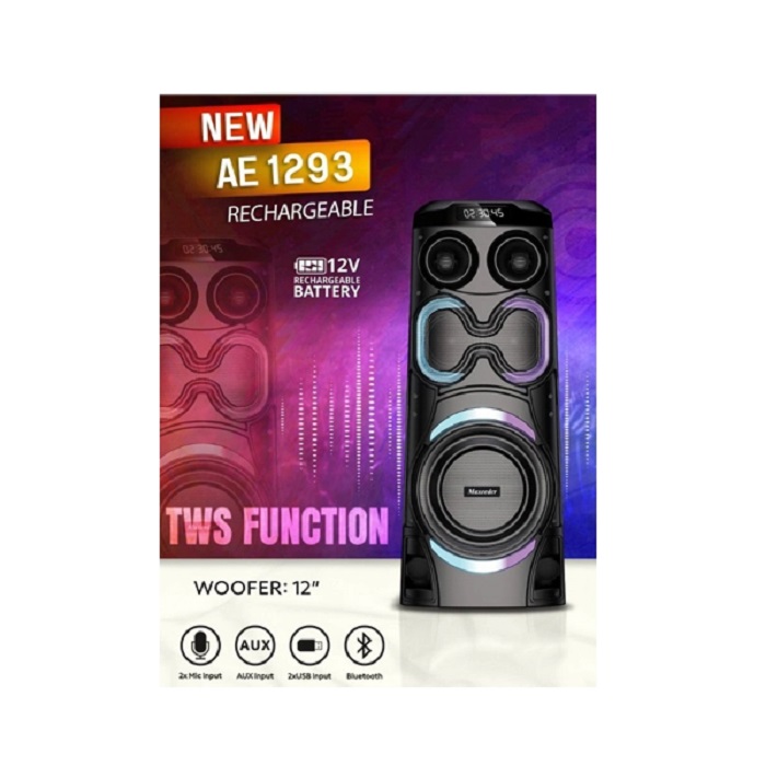 اسپیکر AE 1293 مکسیدر یک سیستم پخش بسیار با کیفیت از سری RECHARGABLE می باشد. این اسپیکر با امکانات پیشرفته تجربهای بینظیر از صدای واضح و قدرتمند را ارائه میدهد. این اسپیکر با سابووفر 12 اینچی، میدرنج و تیوتر امکان پخش موسیقی با ابعاد صوتی چشمگیر را میدهد.